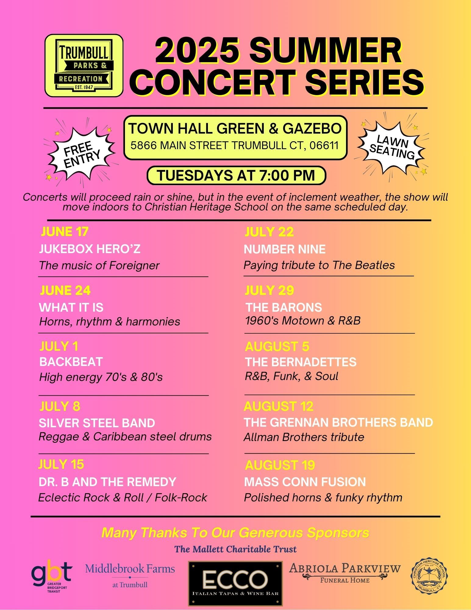 The Town of Trumbull’s Summer Concert Series is presented by the generous support of our sponsors. Concerts occur Tuesdays from 7:00 PM to 8:30 PM at the Town Hall Green and Gazebo.