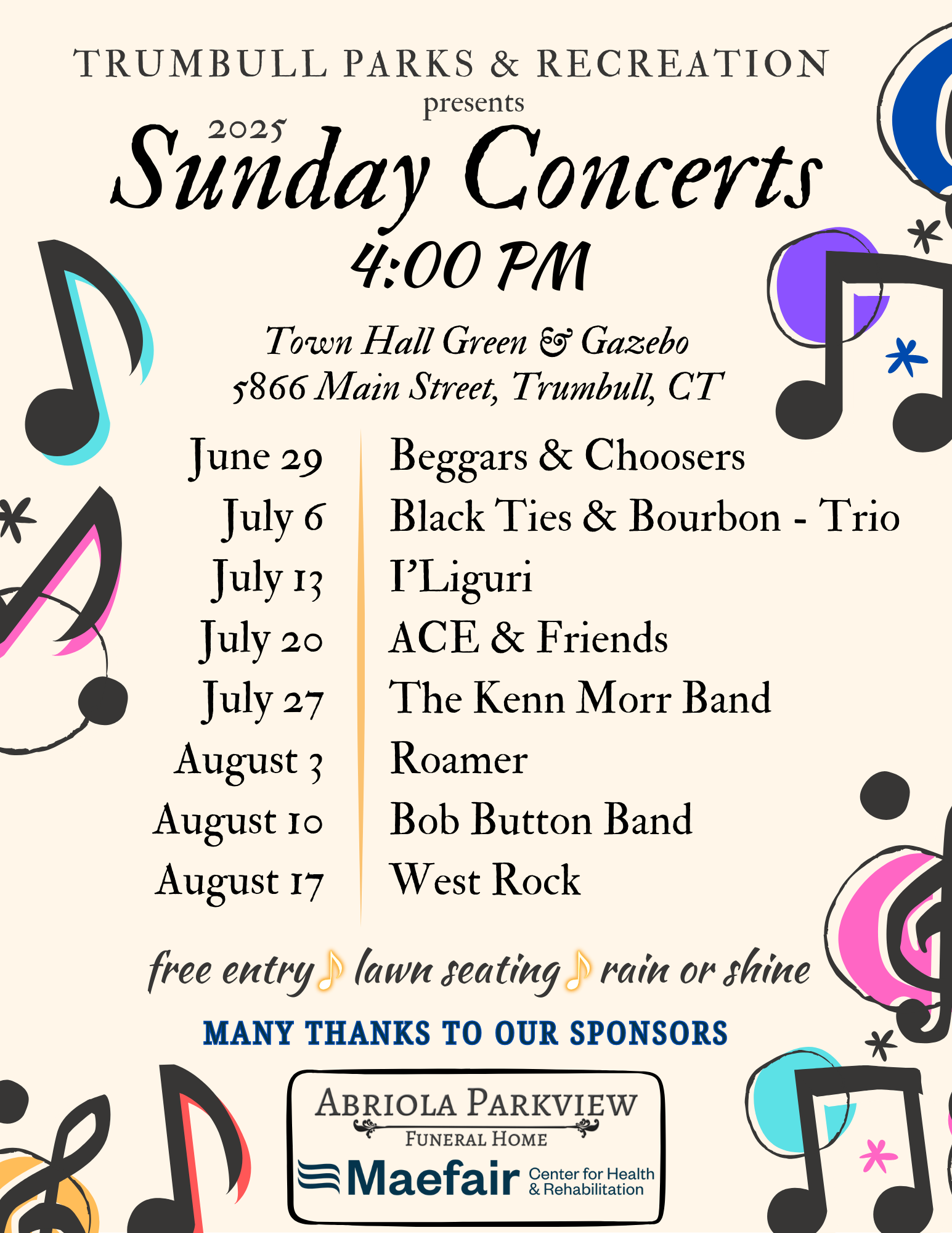 All concerts takes place on a Sunday at 4:00 PM at the Trumbull Town Hall Gazebo, 5866 Main Street.